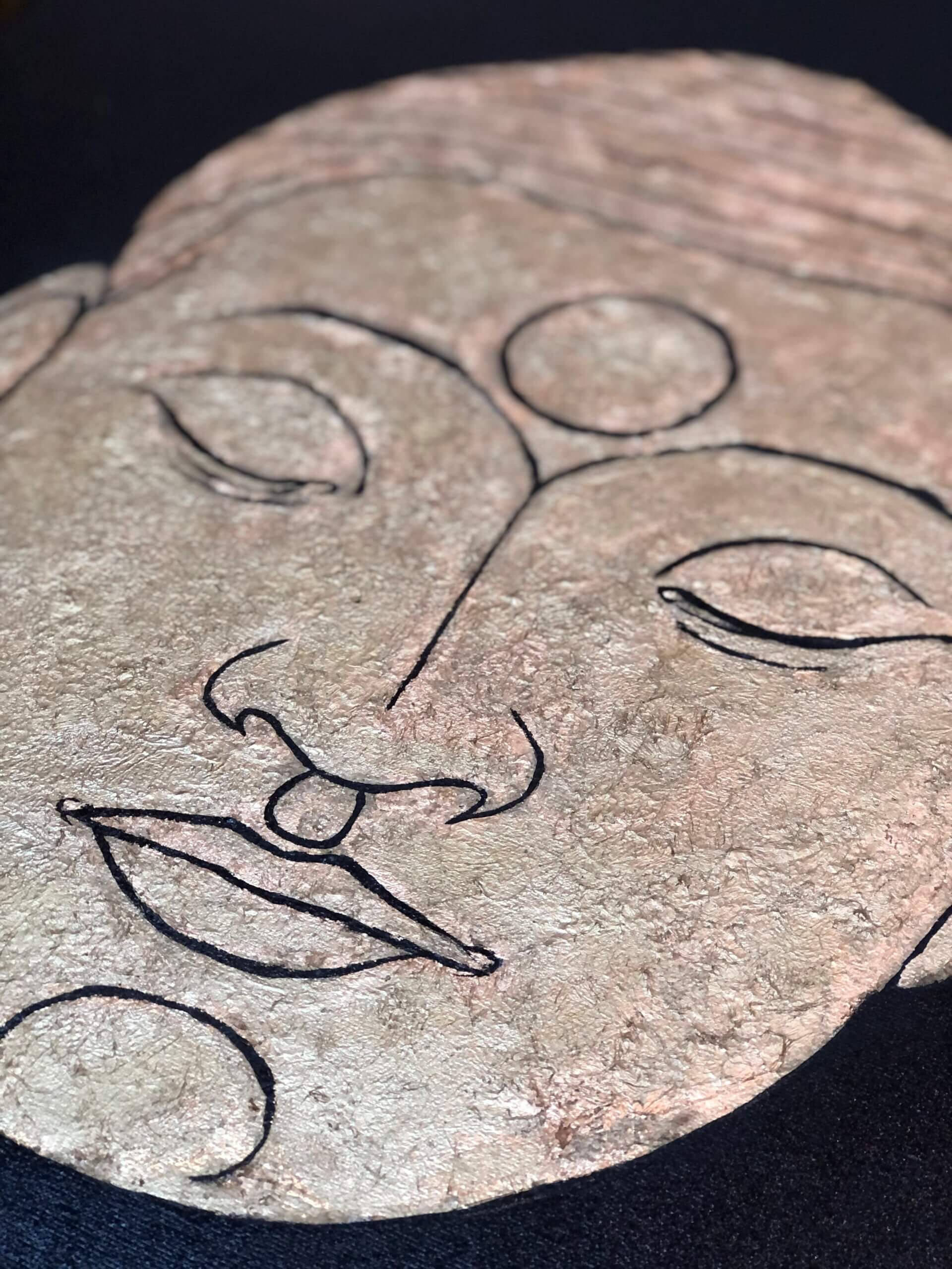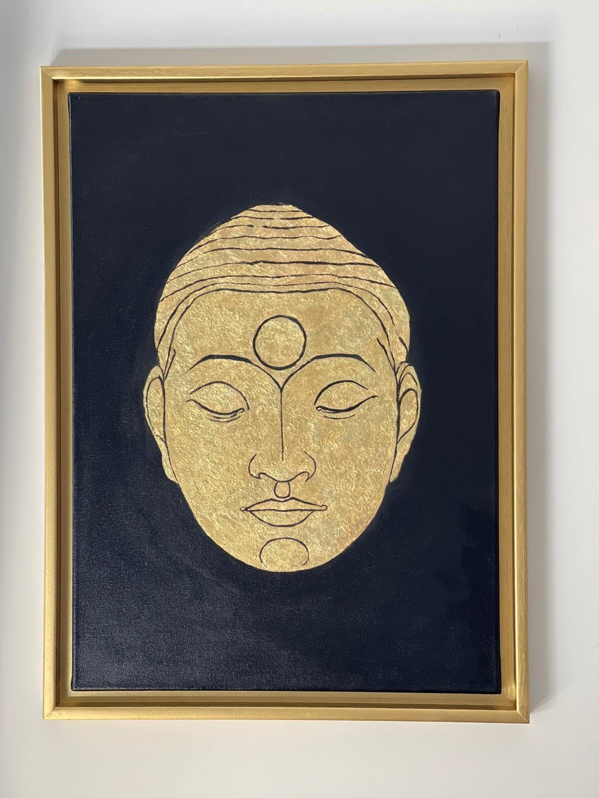 Partimos de la obra : Head of buda – 1943 – Reijer Stolk y re versionándola a una técnica de dorado a la hoja y pigmento metalizado en oro.