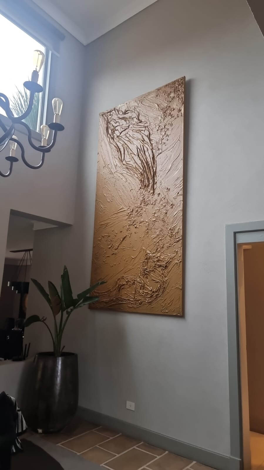 Ella se contactó conmigo para pedirme una obra que se aprecie en la altura, que evoque inmensidad, que esté cargada de la fuerza de la textura característica que suelo utilizar para mis cuadros.