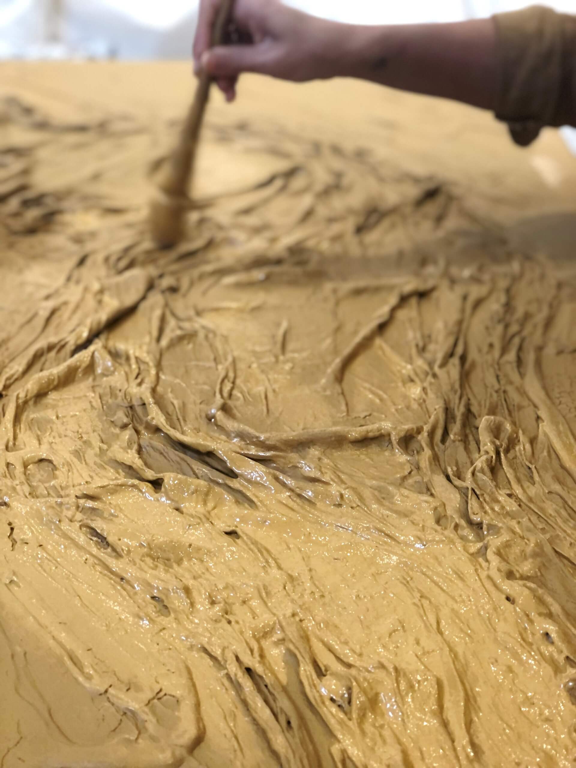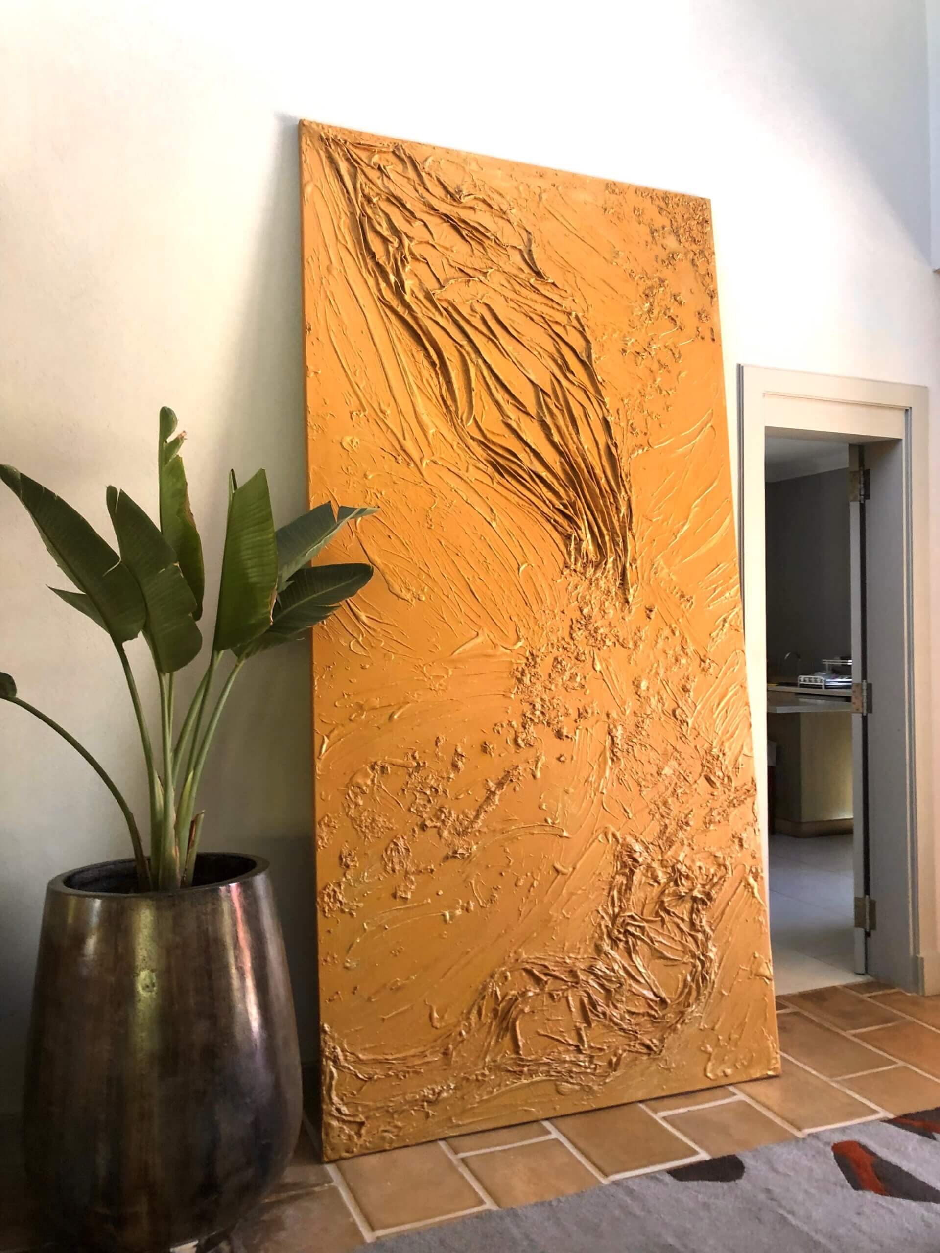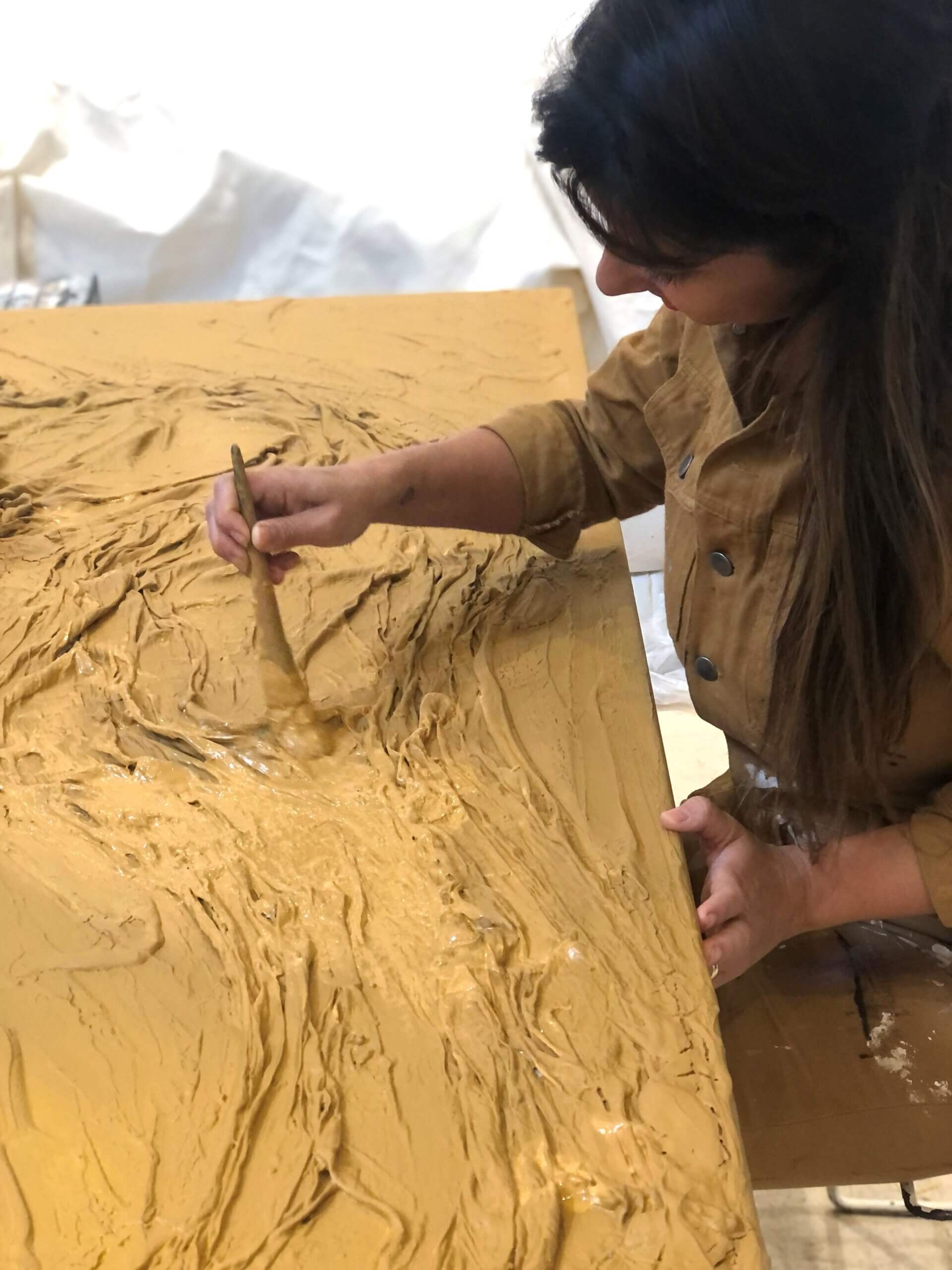El resultado, una obra plena, color ocre, en movimiento de textura textil y pasta de eucalipto.